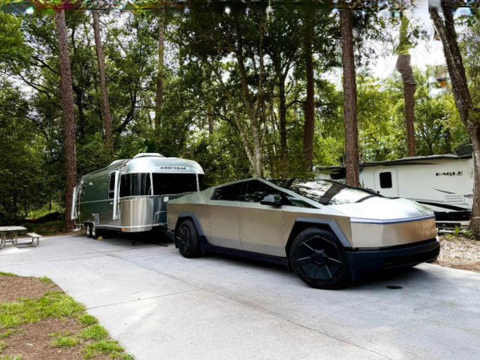 It’s a Cybertruck towing a silver Airstream, Starlink dish bolted to the roof, parked on empty desert where no cell tower reaches.